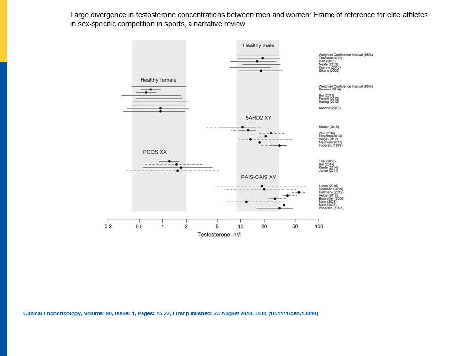 With regard to plasma levels of testosterone. Generally, adult men and women under the age of 50 do not overlap. BUT there is individual variation with genetics and also time of day, general health, stress levels etc. And plasma T levels in infants and children do not differ at all. Here is a graph that shows variation in the general population and in people with certain medical conditions. I can't vouch for the quality of this review or how comparable the methods are in the different pubs cited. One other point about this graph: Look at the T levels for CAIS and PAIS WOMEN! They are XY and despite high T levels, their cells cannot bind the T (defective androgen receptor), so they often have vaginal labia and large breasts. Breast and genital morphology diverge from T levels.